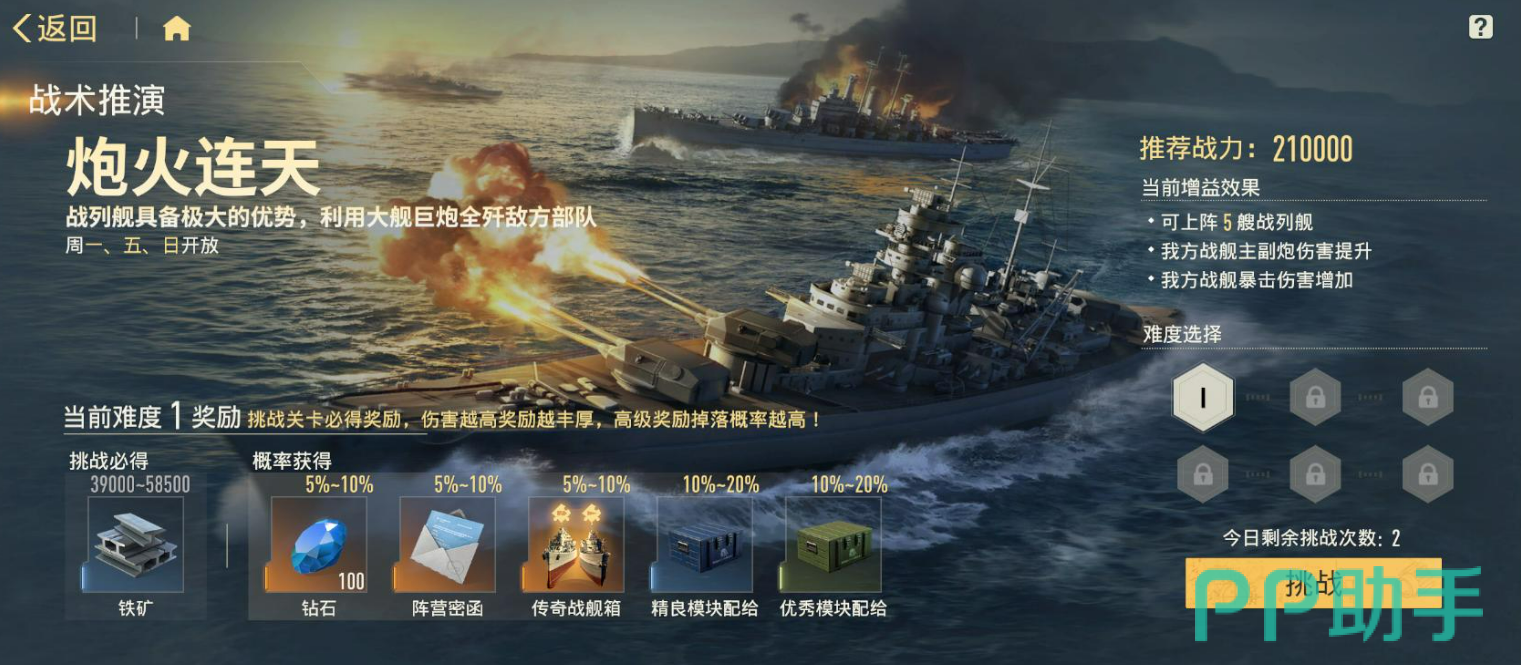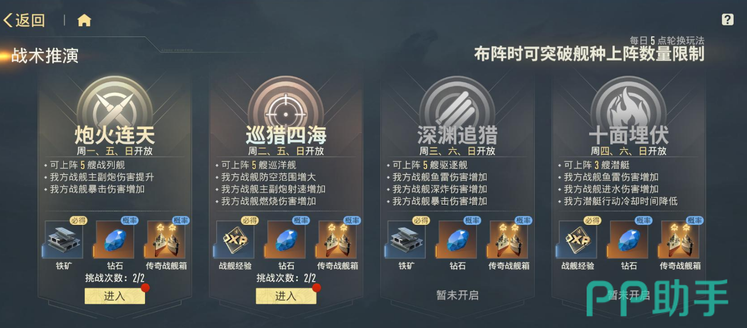 战术推演为纯主线驱动型玩法,当推进至指定章节后自动解锁,无需额外操作。该模式划分为四大主题——炮火连天、巡猎四海、深渊追猎、十面埋伏,分别适配不同舰种体系。每个主题含六阶递进式挑战,通关当前阶即自动开放下一阶,无评级硬性要求。参与次数受时间限制:每周四可挑战4次,周六2次,周日1次,需合理规划挑战节奏。