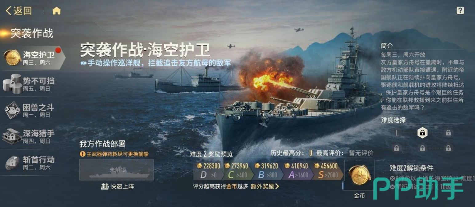 突袭作战是体验感最接近隐藏副本的玩法。开启前提是完成主线至“占领斯特林博格港口”节点。该模式包含五类舰种专属副本:战列舰、巡洋舰、驱逐舰、潜艇、航母,按周循环开放,每日仅限一种类型可挑战。每类副本设多阶难度,必须在当前阶次获得S评级,方可解锁下一阶。各舰种任务目标差异显著:战列舰需护送爆破船摧毁海上油井;巡洋舰负责掩护友方航母并拦截敌方舰队;驱逐舰追踪决战级战列舰执行追击;潜艇以最大化击沉敌方运输船为评分依据;航母则须在夜间环境下定位并歼灭指定敌舰。不同舰种对应的操作节奏与战术重心截然不同,无法套用统一策略。