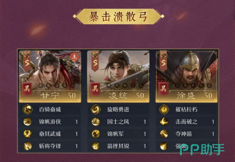 吴国武将徐盛主打统率压制与爆发输出。主将技“摧枯拉朽”对单体目标造成武力伤害,并使全体敌方武将统率降低,持续6秒;固有技“击而破之”在提升自身暴击率的同时,降低目标部队全体敌军统率,并附加一次武力伤害。双层统率削弱机制使其成为破防体系核心,特别适合搭配甘宁、凌统组成高速突进流派,快速瓦解敌方前排承伤结构。