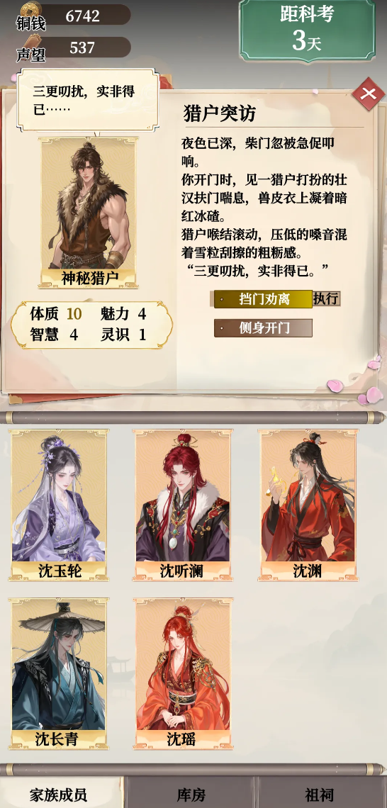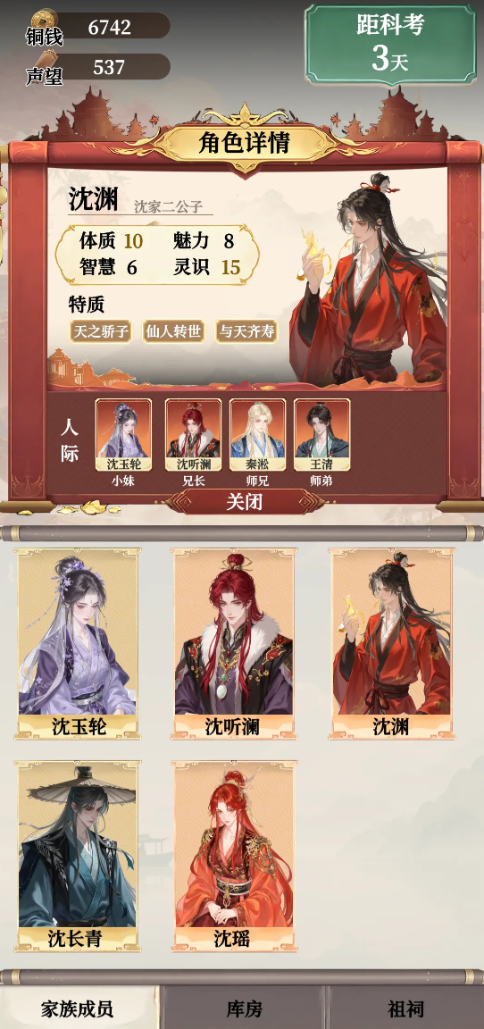 游戏给玩家设置了非常具有挑战性的开局,玩家身处一个摇摇欲坠的腐朽王朝之中,继承了祖宅,肩负起了培养一个自带满级buff神童的重任。这不是一个简单的带娃游戏,而是一个有关权力、财富和长生的布局策略游戏。玩家的选择会直接影响到故事的发展走向,玩家是推翻旧统治自立为王,还是在朝堂之上权倾朝野,或者是积累商业资本富可敌国,还是踏上修仙之路追求长生不老。由于具有很高的自由度,这就使得每一个游戏的旅程都是未知且有变数的。