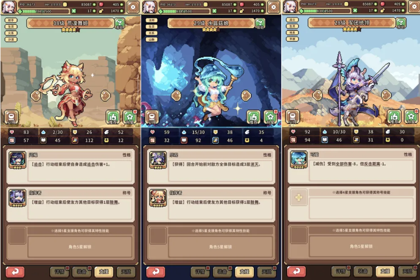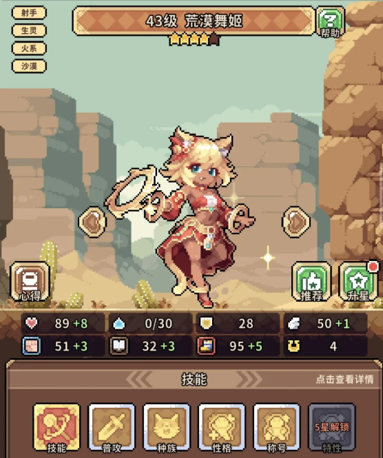 前期搭配当中大家可以用到的有火猫、水晶菇以及人马,这3个角色的话也是新手比较容易拿到的角色,火猫在游戏当中就代表的荒漠舞姬这个角色,她在自身能力效果当中可以带来的闪耀技能进行追击的话,行动结束之后就可以给她带来多次的追击伤害,并且还可以带来行动结束之后的增益,让其他友方的角色获得一层的鼓舞,而这里水晶菇娘的话,她在自身获得一开始对敌人进行三层泯灭的情况下,增益效果也可以让其他的队友获取更多的鼓舞,而最后人马,也就是军团统领这个角色,可以给我方角色带来的是减伤能力,受到的全部伤害数值上面会减少8点,但是这里反击距离是会减少1点,所以大家要注意避免她这部分的弱势,这里其实核心角色就是荒漠舞姬,也就是火猫,她自身的核心输出强度是阵容里面最高的,而且后期也可以给其他的成员进行回蓝,拿到这个角色之后,建议大家一定要先把她进行升星。