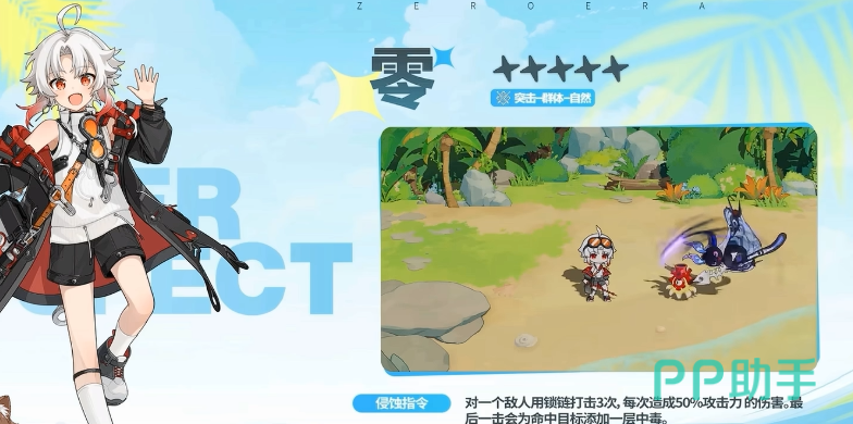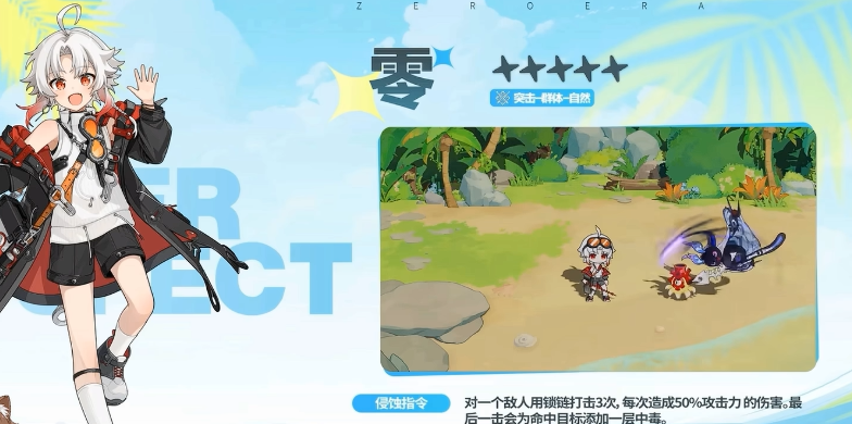 零的突击能力不弱的同时,还有一部分的群体输出效果,所以在自身的属性出发上面,大家要知道他如何用到自身各方面技能效果,他的第一个小技能叫做侵蚀指令,这个能力会让他对敌人进行3次连击,这里用锁链造成了连击效果之后,每次造成50%攻击力的伤害时,最后一击会为命中目标添加上一层中毒的效果,而这部分能力正好是零可以带来的持续输出效果,他如果添加成功的话,这一层中毒后期还可以层层进行叠加。