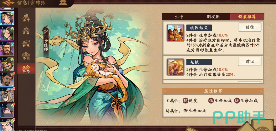 锦囊搭配上,【桃园结义】为最优解:四件套效果允许步练师在治疗一名队友时,额外将本次治疗量的15%均分给当前生命百分比最低的两名友方单位,极大扩展治疗覆盖范围;两件套仅提供10%基础生命加成,功能性较弱。若暂未集齐该锦囊,【屯粮】为可靠替代方案——其四件套可提升步练师全部治疗效果20%,配合装备与副属性进一步叠加,可显著放大其奶量上限,打造高强度续航核心。