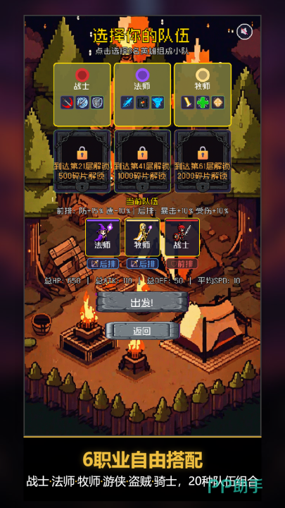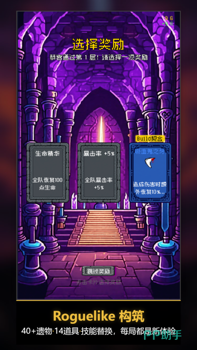 全游戏共设六种基础职业,彼此间存在克制关系与协同潜力,支持玩家依战术偏好灵活组队。实战中可手动设定角色行动顺序,系统同步生成战斗日志,便于复盘决策链路。每通过一层,将随机授予一项增益效果(Buff),例如专注暴击流派可优先强化暴击率与暴击伤害;若倾向持久作战,则可侧重生命恢复、减伤或续航类能力加成。