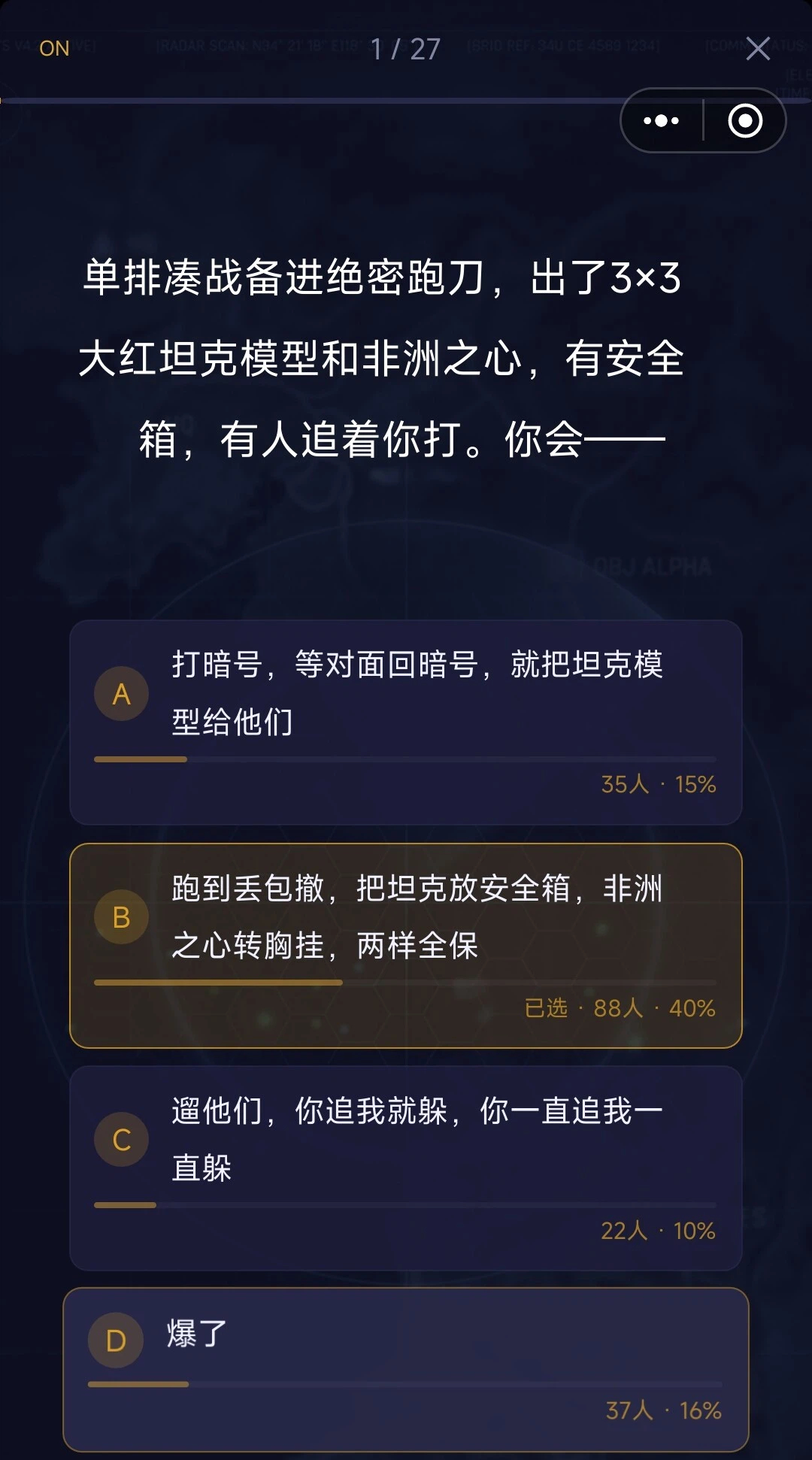 玩家每进行一次选择后,可以看到和自己做出相同选择的人数和占比,能让玩家更准确地对自己进行定位。这些测试题目没有时间限制,玩家不必着急,可以设想自己在对应场景中会做出怎样的选择,考虑得越全面,测试结果就越准确。