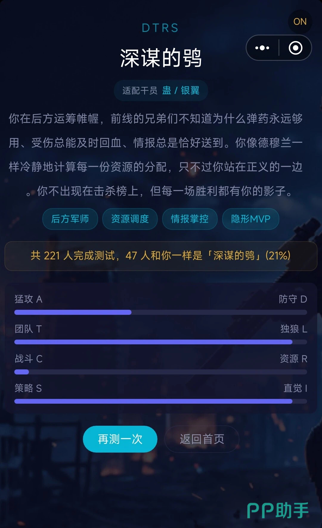 完成27道测试题之后,就会得出最终的人格代码,人格代码由四个字母组成,下面有便于玩家理解的中文代号以及对应人格的详细解析。在分析结果中,还推荐了玩家适合的团队位置,比如“深谋的鸮”就适合做后方军师,从事资源调度、情报掌控工作。