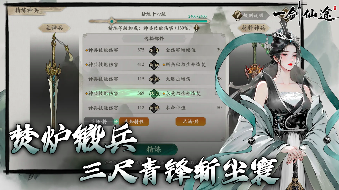 除了视角和画面的创新外,相较于同类型的修仙游戏,在养成系统中也做出了自己的特色,实现了真正的自由化,游戏里没有固定的职业模式,玩家要想打造专属的招式,就是要通过武学的学习和武器的打造,在这里可以炼制自己的本命飞剑,淬炼、祝灵等一系列操作都要你一手掌握。