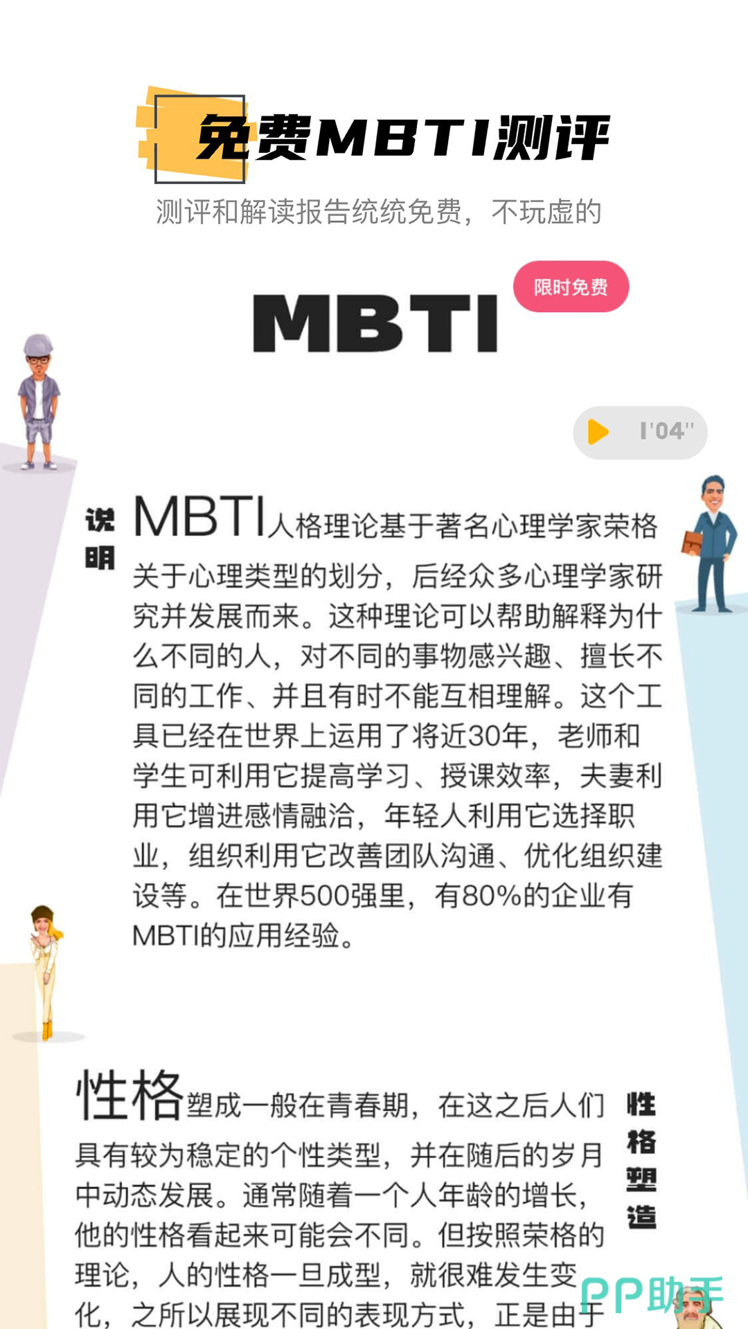 该应用提供完整版MBTI性格类型测试,全程零费用、无时间限制,题量精简,通常3至5分钟即可完成。生成的分析报告篇幅适中,语言平实清晰,避免使用生硬的专业词汇。除经典量表外,还内置多项趣味向小测验,如压力反应模式、日常情绪偏好等,结果即时呈现,界面干净,无干扰性弹窗广告。