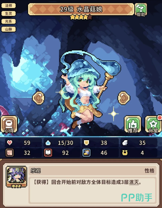首位推荐角色为「水晶菇娘」。该角色在当前环境中的战略价值突出,定位为高覆盖率蓝量支援型辅助。其核心机制在于稳定提供大额技能回能,可显著缩短主力输出角色的大招循环周期。无论在前期速推副本,还是中后期大招流体系中,她均能承担关键节奏调控职能;同时在反击流等依赖技能频次的玩法中亦具备良好兼容性。数值层面,其回蓝量处于全角色前列,且无严苛星级或装备绑定要求,0星即可发挥基础效能,满星后更可进一步强化行动优先级。