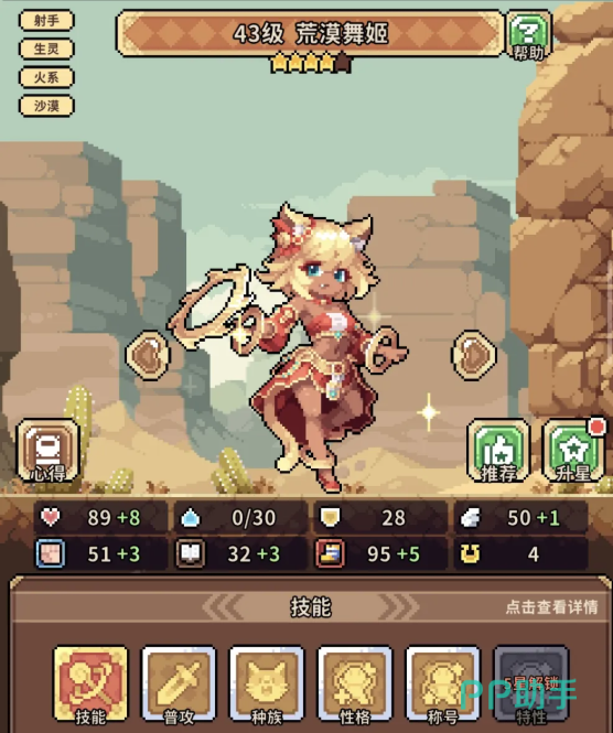 第二位是「荒漠舞姬」,别名火猫、舞娘。该角色属射手职业,兼具物理输出与团队增益双重职能。其标志性能力为投掷回旋镖触发5层「鼓舞」效果,该层数可叠加并持续生效,大幅提升全队攻速与暴击率。值得注意的是,鼓舞效果的实际收益随层数提升呈非线性增长,因此常被用于构筑多段爆发体系。此外,她可适配眩晕类射手专属装备,强化控场衔接能力,在面对高机动性敌人时表现尤为突出。