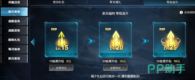 快速起步阶段,优先锁定经验类直购礼包。界面左上角“购买”入口中,首次充值与累计档位奖励可暂缓考虑;建议直接选择标有“15级”“20级”或“25级”的经验包——单次购入即可直达25级,完整解锁全部装备槽位,大幅压缩前期养成时间。值得注意的是,累计充值达标后配套的豪华礼品仍具实用价值,对应档位达成即自动发放,属于稳定可预期的附加收益。