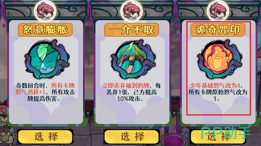 该卡牌主要服务于风系蓬莱路线——该流派初始强度偏低,但具备极佳的节奏延展潜力。诡奇咒印的核心效果为:使少年角色基础怒气值固定为4点,同时将所有卡牌的原始怒气消耗统一降为1点。这一双重调整直接重构了费用模型,大幅压缩出牌门槛,配合回怒类卡牌与过牌手段,可稳定触发多轮循环,部分配置甚至能在单回合内完成Boss击杀。中后期即使角色练度未达满配,亦能维持高频运转,通关效率显著提升。