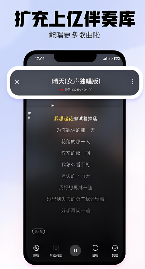 直接接入酷狗音乐海量的曲库资源,能选择唱的歌曲超过4000多万首,且每一首伴奏都是正版,就算是五音不全,也能通过后期的AI美化声线让歌曲变得动听,甚至还能对某一句歌词进行逐句精修,系统给出的评分精准定位,单是凭借评分曲线就能唱好一首歌曲。
