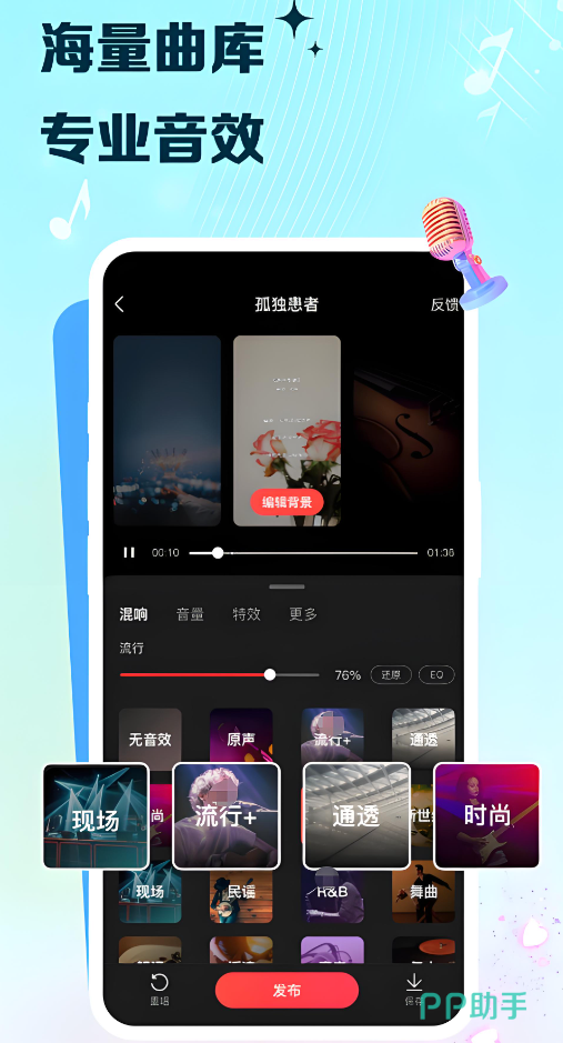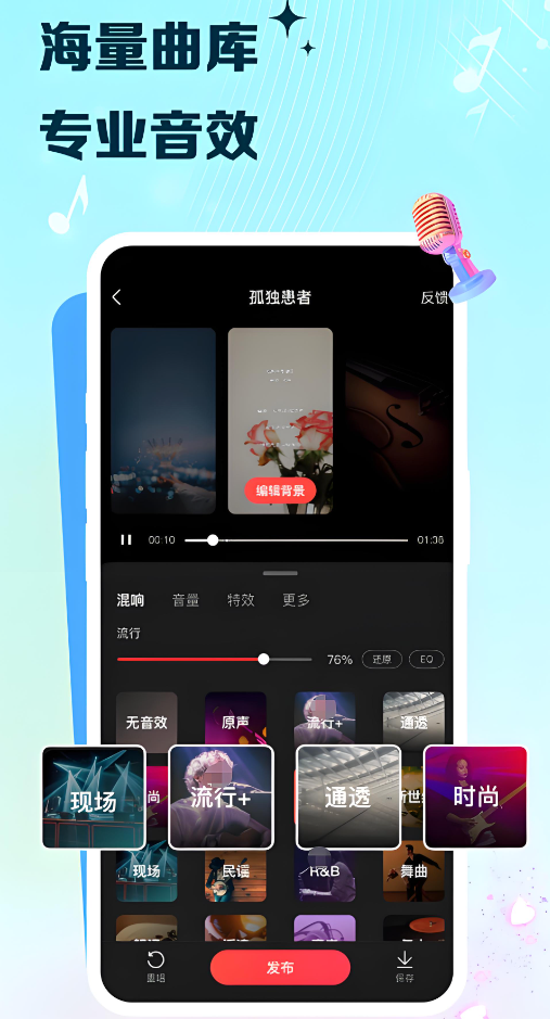 将年轻人喜欢的唱歌和社交融为一体,让音乐不再单调和孤单,能够提供实验室级别的k歌音效,并且通过最新的AI技术修饰音准,让声音变得更加美妙动听,后期能一键进行音准调教以及混音添加,凭借好听的音乐能结识到非常多喜欢唱歌的朋友。