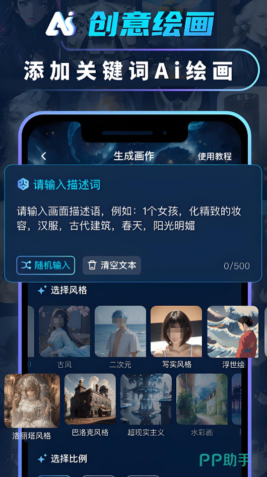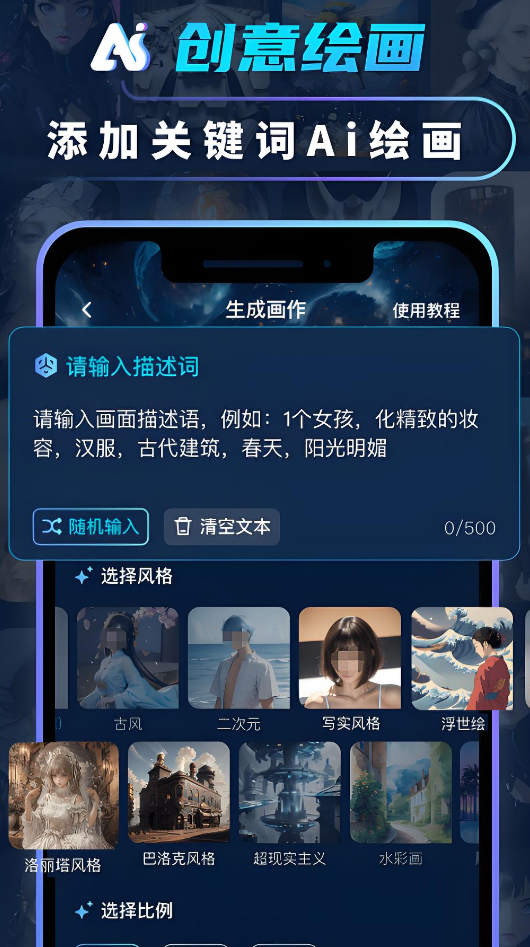 基础的涂色加上简单的绘画就能制作出大师级别的作品,精美的创作搭配上AI辅助让门槛变得非常低,只需通过天马行空的想象搭配创作力就能生成作品,可通过一段文字描述生成,也能通过些许的草稿去改变,内置了十几种的艺术风格能随意去切换改变。