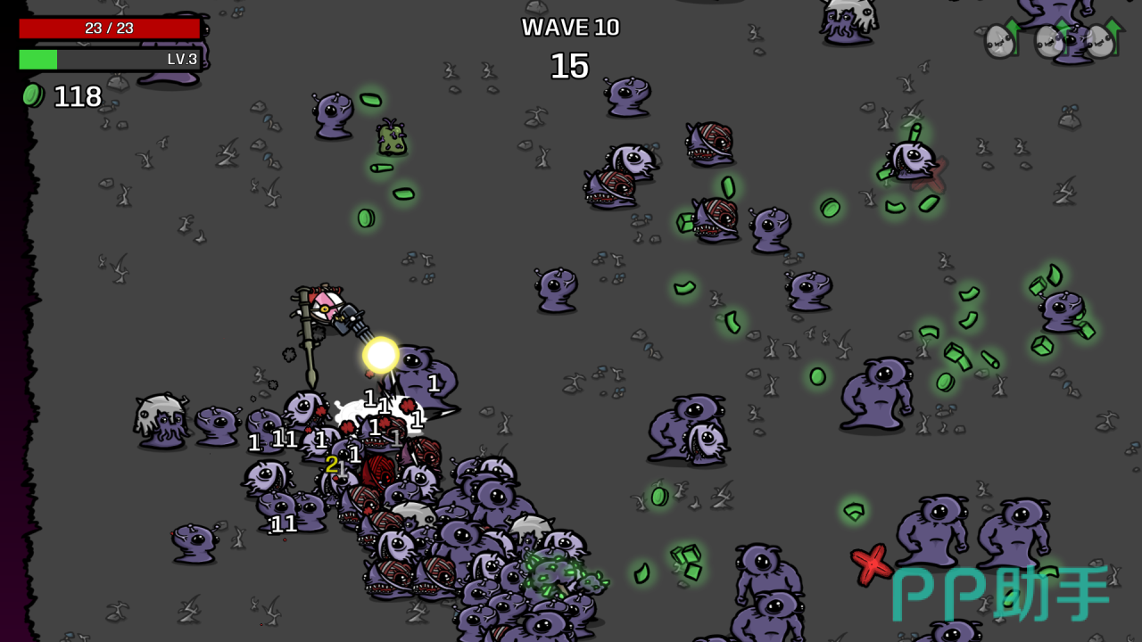 本作采用典型的弹幕生存割草机制:每局战斗中,屏幕持续涌现大量敌人,玩家需在密集弹道与围攻压力下灵活走位、拾取武器模块并实时切换输出策略。全游戏共提供超400种差异化武器,支持双同款武器合成升阶,显著强化单局成长反馈与Build成型速度。