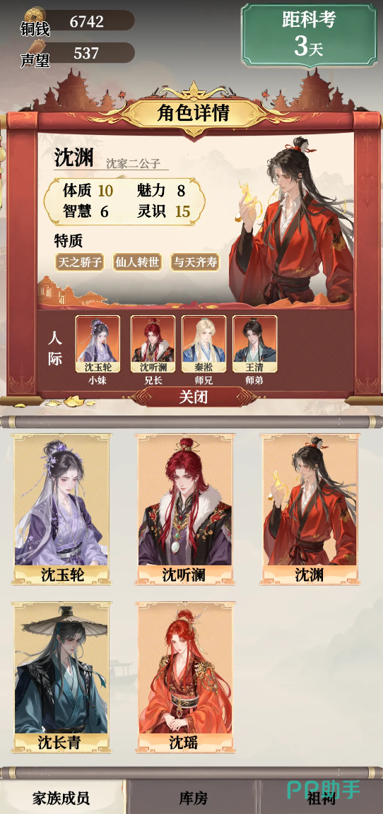 本作将人物维度成长与家族系统建设深度耦合:神童需同步锤炼经史子集(科举线)、灵根悟性(修仙线)或兵法韬略(统军线),各项能力不可偏废;与此同时,玩家须主动走出祖宅,涉足茶楼、戏院、镖局、书肆等真实古代生活场景,通过经营积累声望与银钱,并逐步构建私学、武塾、丹坊、商栈等专属建筑群,为家族复兴夯实根基。