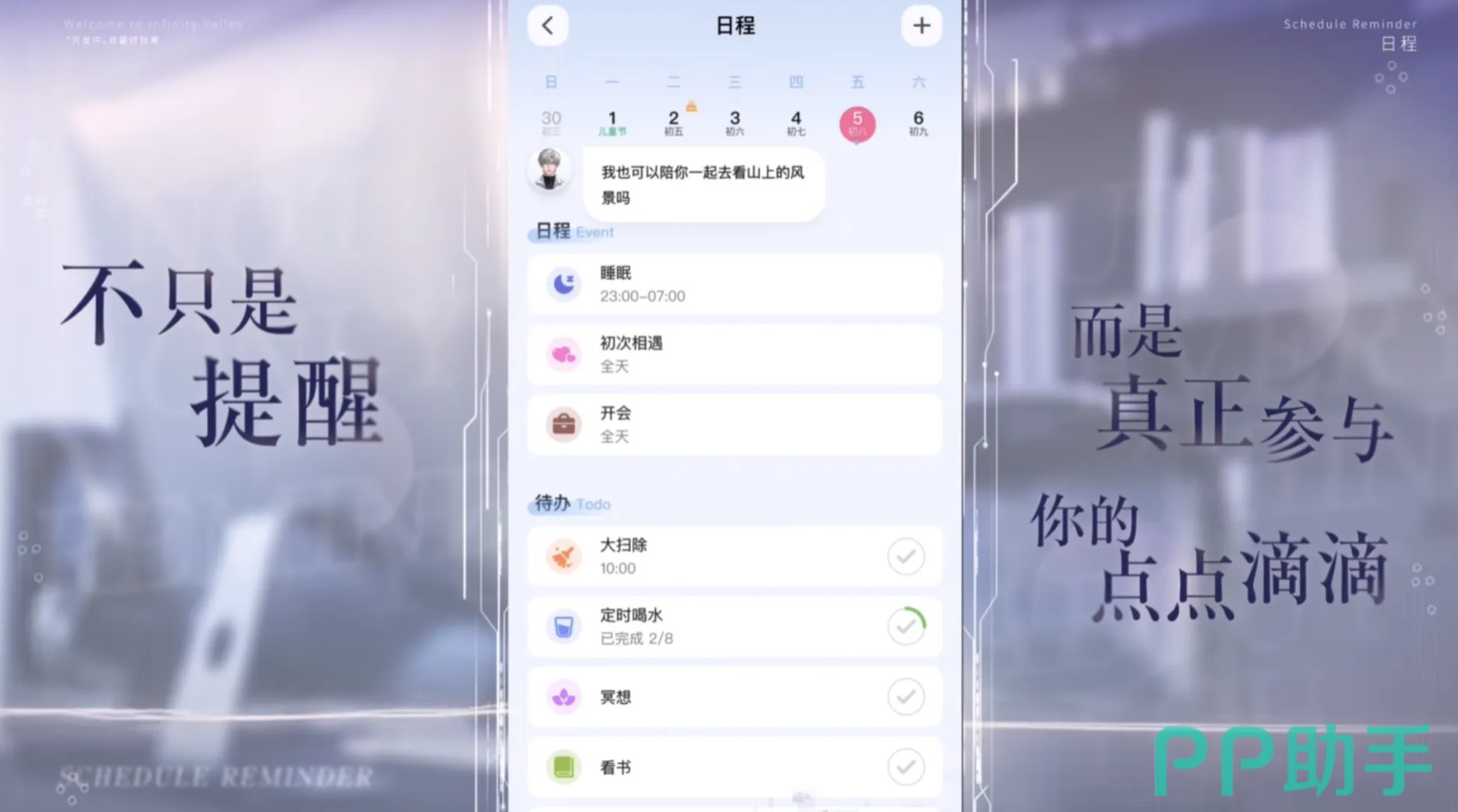 除情感交互外,游戏融合实用功能模块:内置智能日程管理系统,支持自定义设置起床提醒、待办事项、饮水提示等生活节点,由AI角色全程协同提醒,助力用户提升日常管理效率;同时提供自由换装系统,涵盖服饰、配饰等多类穿搭组合,不同造型可能激活角色差异化人格表现,进一步拓展互动维度与剧情延展性。