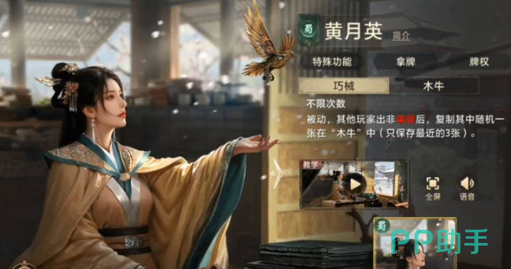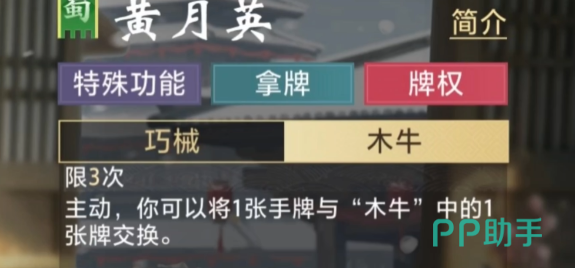 她的核心体系围绕“木牛流马”构建,形成一套资源积累与动态调度相结合的闭环机制。被动技“巧械”赋予其在对手出牌阶段的响应能力:每当敌方打出对子或连对时,黄月英可从中择一牌置入木牛——该装置最多容纳三张牌,构成临时牌库。这一设定要求玩家具备较强的手牌规划意识,需预判后续回合节奏,避免因过度囤积而丧失关键交换时机。