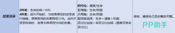 首选锦囊为铁锁连环:该锦囊不仅强化郭嘉对敌方增益状态的压制能力(尤其配合专属武器使用时可精准驱散关键Buff),更通过套装效果构建团队防护体系。两件套提供10%生命值加成;四件套激活后,战斗初始即与后排队友建立连环链接——使队友所受伤害降低15%,且当敌方对我方单位发起攻击时,郭嘉可主动承担50%的原始伤害,显著提升队伍整体承伤韧性。此配置将郭嘉从单点输出者转化为团队生存中枢。