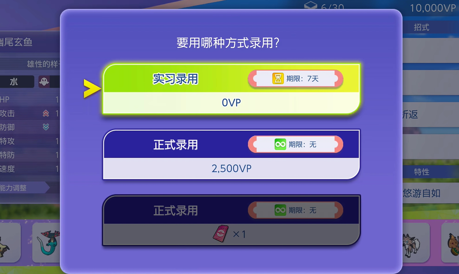 此外,游戏还会在开局时为玩家们送上六只宝可梦,确保玩家可组建出一支宝可梦队伍参与对战,往后要是再想获得宝可梦,可通过录用的方式来获取,并且游戏还提供了实习录用和正式录用两种方式供玩家们去选择,其中实习录用可让玩家免费获得7天的宝可梦使用权,在这7天内玩家可随意使用此宝可梦,但7天后它就会被回收。而正式录用则能让玩家永久获得所选的宝可梦,但需要花费一定的成本,玩家可在遇到自己心仪的宝可梦时使用这一录用方式。