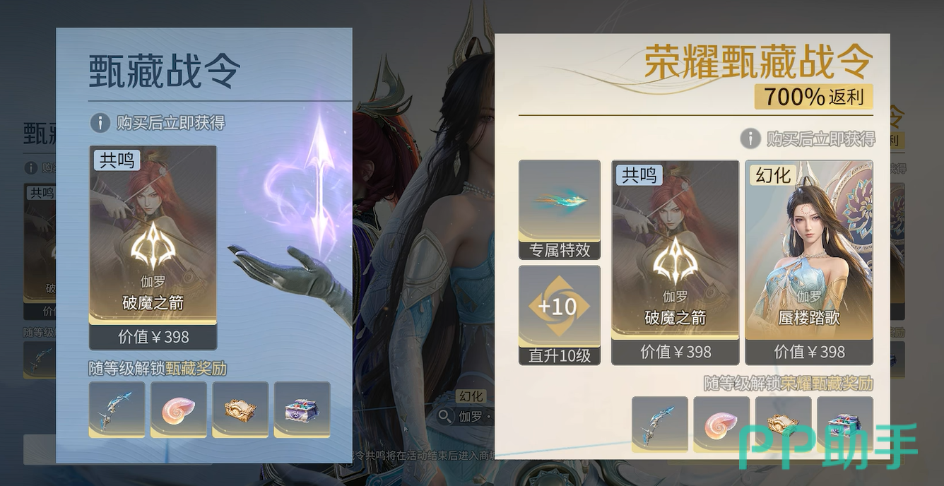 另一种是典藏战令,售价168元,这个版本就比较直接了,买完立刻就能拿到伽罗和金色皮肤,不用等级慢慢升。除了角色和皮肤之外,还会送一些晶珀、角色培养材料和其他外观道具,对于想快速组建队伍的玩家来说,会方便很多。毕竟开放世界游戏前期角色不够用的话,很多内容推进起来,会比较吃力。