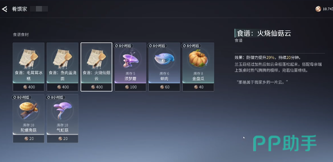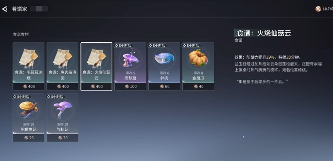 这道食谱没有办法通过任务获取,必须要来到指定的地点购买。具体的位置就是稷下群山潭影营地,大家打开地图之后就可以直接定位过去,然后找到标识就能够前往。这个位置还是比较显眼的,沿着主路走,马上就能够轻松的找到。在抵达位置之后就可以找到肴馔家的余欢。这就是一个专属的商人,主要就是卖各种厨师食谱。在打开对话框之后就可以花费少量的游戏货币,然后购买价格是比较亲民的,不需要去消耗稀有的道具。在购买完成之后,打开背包学习食谱,然后找到游戏中的烹饪界面,食不厌精就是专门制作的地方,大家可以在料理列表中找到火烧仙菇云,然后看一下所需要的材料。