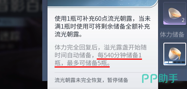 体力在游戏中的名称是原力。初始的上限是160点,每8分钟就会自动的恢复一点,全天自然恢复180点。角色等级提升也会逐步的提高体力的上限,在满级之后上限还会大幅度的增加。一开始就不需要去纠结上限,应该优先保证体力不会溢出。体力恢复就会有三种方法,第一种就是自然恢复离线,在线也可以上涨,这就是比较稳定的来源。第二个就是每日补给游戏,每天固定的时间发放两次礼包,每一次是60点,第三个就是使用道具来恢复。