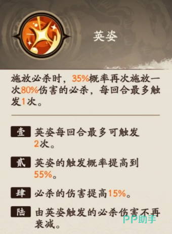 周瑜他的天赋叫做英姿,这个天赋目前在释放自身必杀技的时候,会有35%的概率可以触发一次额外的输出效果,这里可以带来的额外输出跟其他武将不一样,很多武将在游戏当中如果触发额外输出时候,带来的只是基础的普攻,但是他在这里通过这个概率触发的是一次80%伤害的必杀技,所以他可以在释放自身大招效果的时候,有一定概率可以连续再一次触发自身的必伤,每个回合当中虽然这个触发效果只能触发一次,但是他在场内的情况下多个合合里面都可以用到这个能力,所以放在目前连续攻击效果当中,这个概率只要能够提升,那么这里用到的效果就会越好,他后期将这个天赋达到一命的情况下,每一个回合都可以触发两次,那么他在此时带来的效果就已经比较强了。