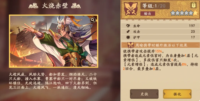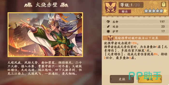 所以玩周瑜的话,他的此类功能大家玩儿起来的话就要注意天赋能力跟必杀技的配合。只要这里的。各种火元素攻击,能够快速的用出来。他在游戏当中的强度也是可以快速达到大家的需要的群体强度。