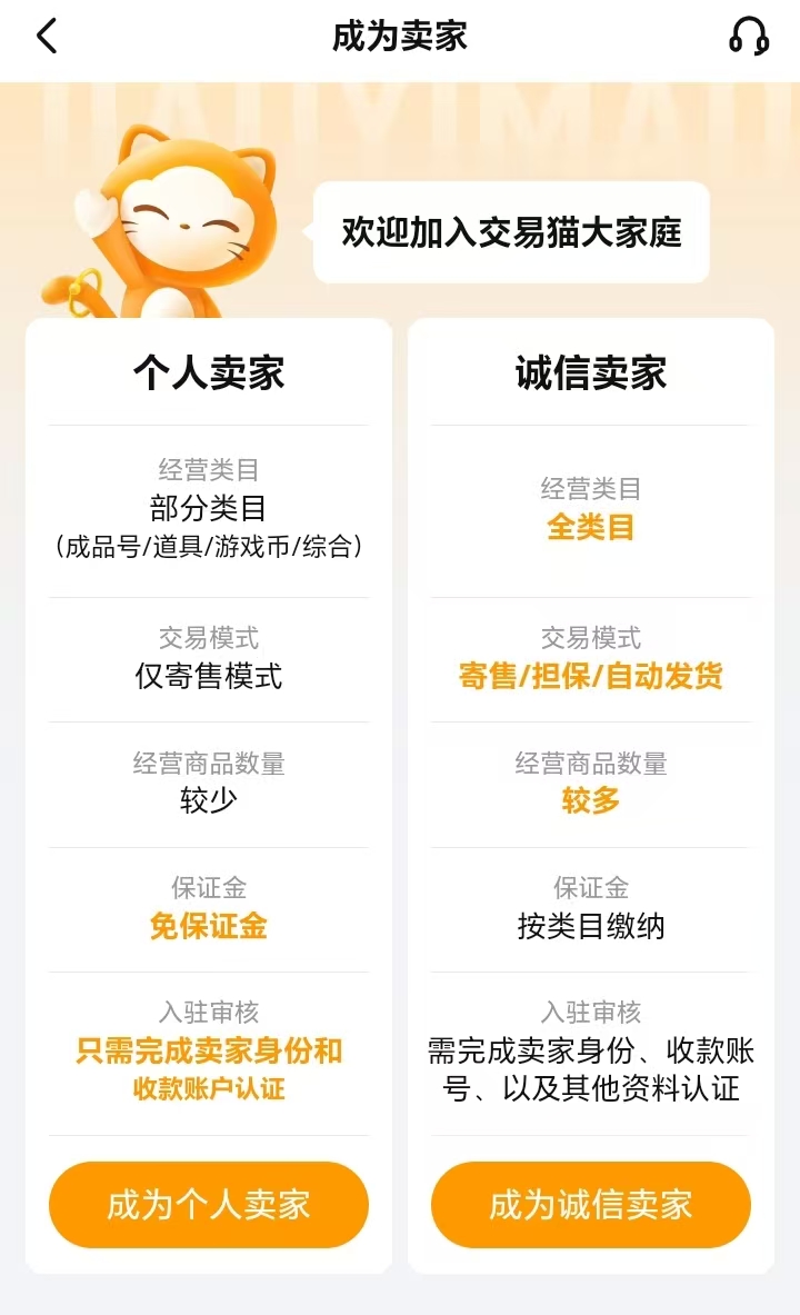 平台支持双模式卖家身份:个人卖家零保证金入驻,适合单次或低频交易用户;诚信卖家需缴纳基础保证金,享有更高商品上架额度、专属客服通道及优先审核权益。用户可根据自身交易频次、账号数量及运营规划灵活选择对应身份类型。
