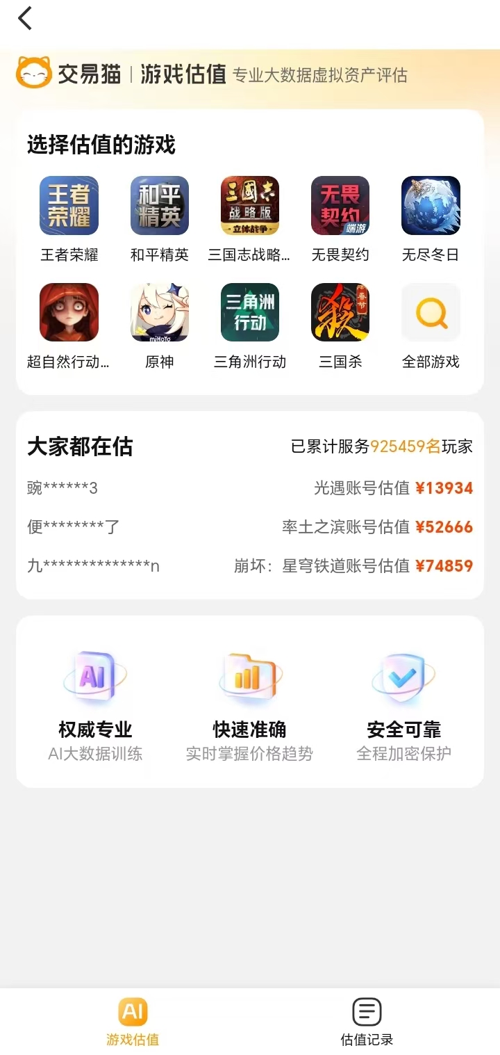 交易猫内置免费AI智能估值系统,已为近100万用户提供实时、客观的账号价值评估服务。用户仅需进入“我的”页面,点击“账号估值”,上传角色信息及截图,系统即可基于市场行情、历史成交数据、账号属性等多维因子生成参考报价,帮助卖家合理定价、高效变现。