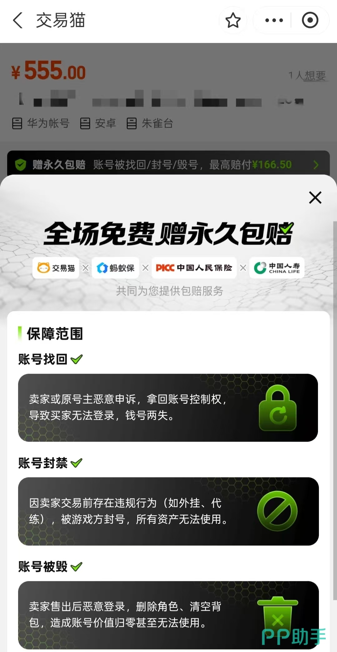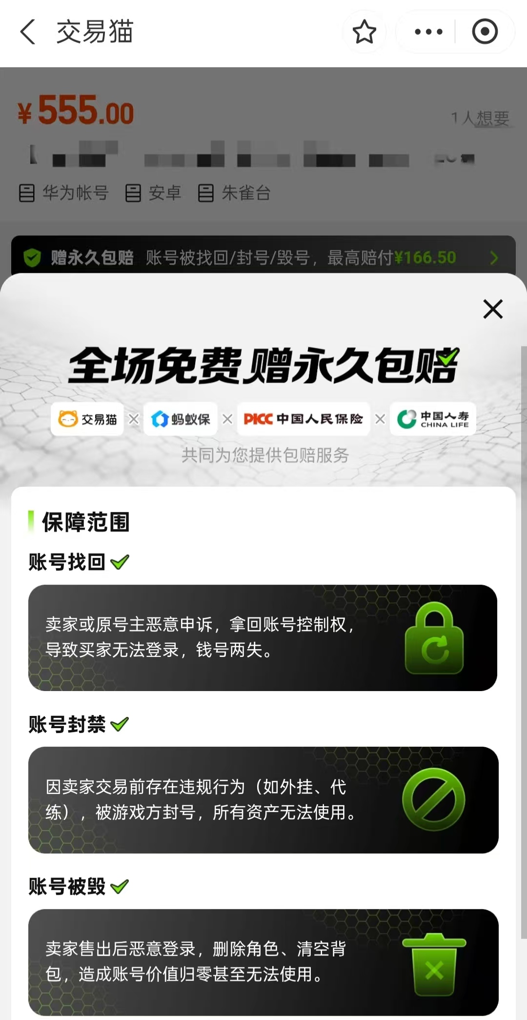 针对账号安全这一核心痛点,交易猫在业内率先推出“永久包赔”服务承诺:无论购买后使用时长多久,若发生角色被删除、数据异常损毁、原号主恶意找回等情形,平台将依据协议条款按比例进行赔付。该机制已纳入平台服务标准,并在用户协议中明确公示,切实提升交易确定性。