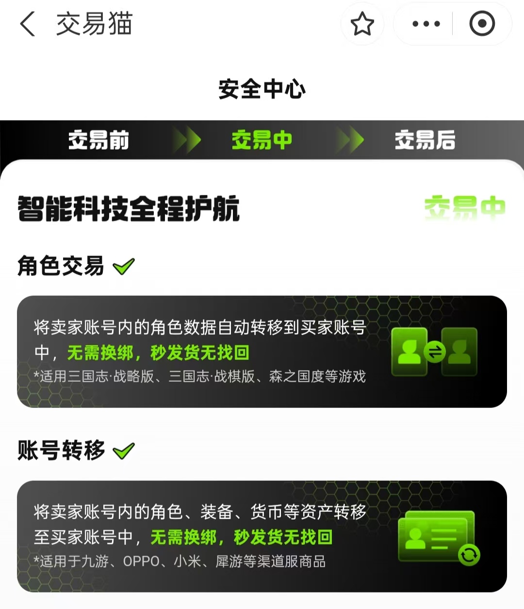 交易猫是当前国内游戏虚拟资产交易领域中用户基数最大、合规性最强的专业平台之一。其覆盖《倩女幽魂》在内的超100款主流游戏,所有上架账号均经官方验号系统多重核验——包括实名信息有效性、历史封禁记录、绑定设备数量、登录异常频次等关键维度。平台采用智能风控模型自动拦截信息缺失、来源不明或存在高风险行为的账号,确保前台展示商品真实可交付。