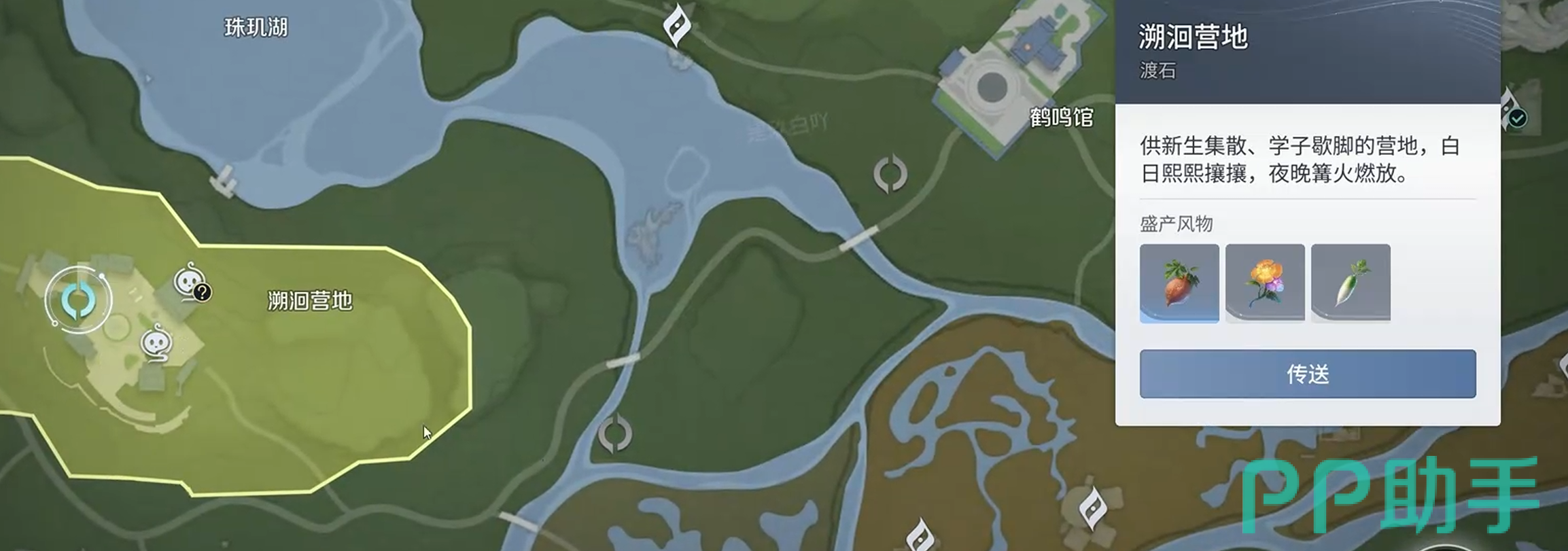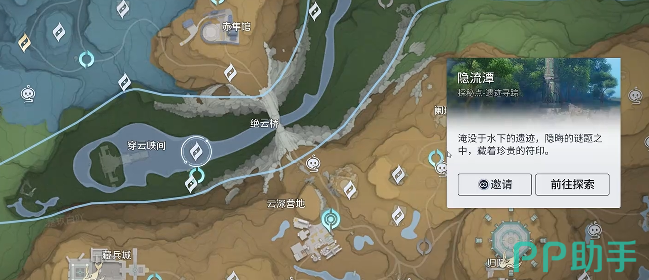 第一步:传送至鹤鸣馆渡石。打开大地图,精准定位该传送锚点并完成传送。抵达后勿急于横向移动,优先观察界面左上方区域——此处标有“伏流窟”探秘点图标,即为当前目标入口,沿路径直线前进即可抵达洞口。