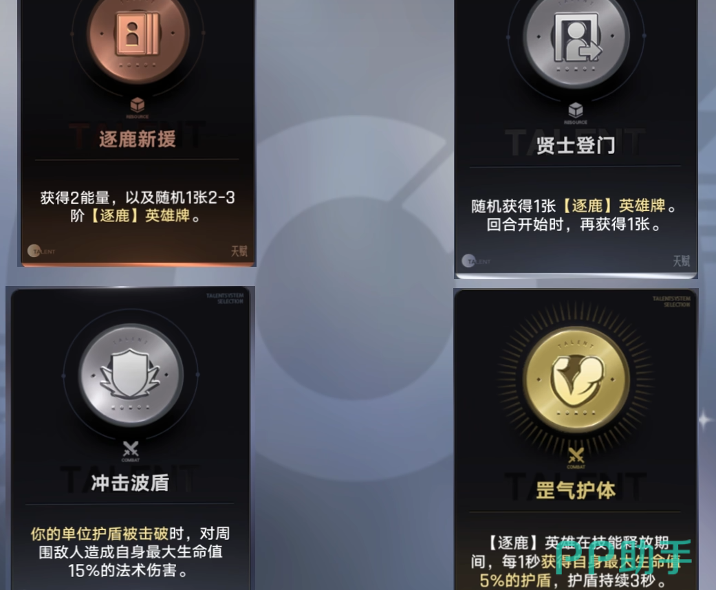 天赋搭配需紧密围绕“逐鹿”阵营特性展开。首推【逐鹿新援】:每回合提供2点能量,并随机获得一张2阶或3阶逐鹿英雄牌,大幅提升关键卡牌的搜寻效率。次选【贤士登门】:回合开始时先获取一张逐鹿英雄牌,随后再补一张,强化中期过渡强度。第三项核心天赋为【冲击波盾】:单位护盾被击破时,对周围敌人造成相当于自身最大生命值15%的法术伤害——此为炸盾体系的核心爆发逻辑,直接决定清场能力。最后推荐【罡气护体】:逐鹿英雄在施放技能期间,每秒获得相当于自身最大生命值5%的护盾,持续3秒,与【冲击波盾】形成无缝衔接,实现“护盾生成—护盾破裂—范围反伤”的完整循环。