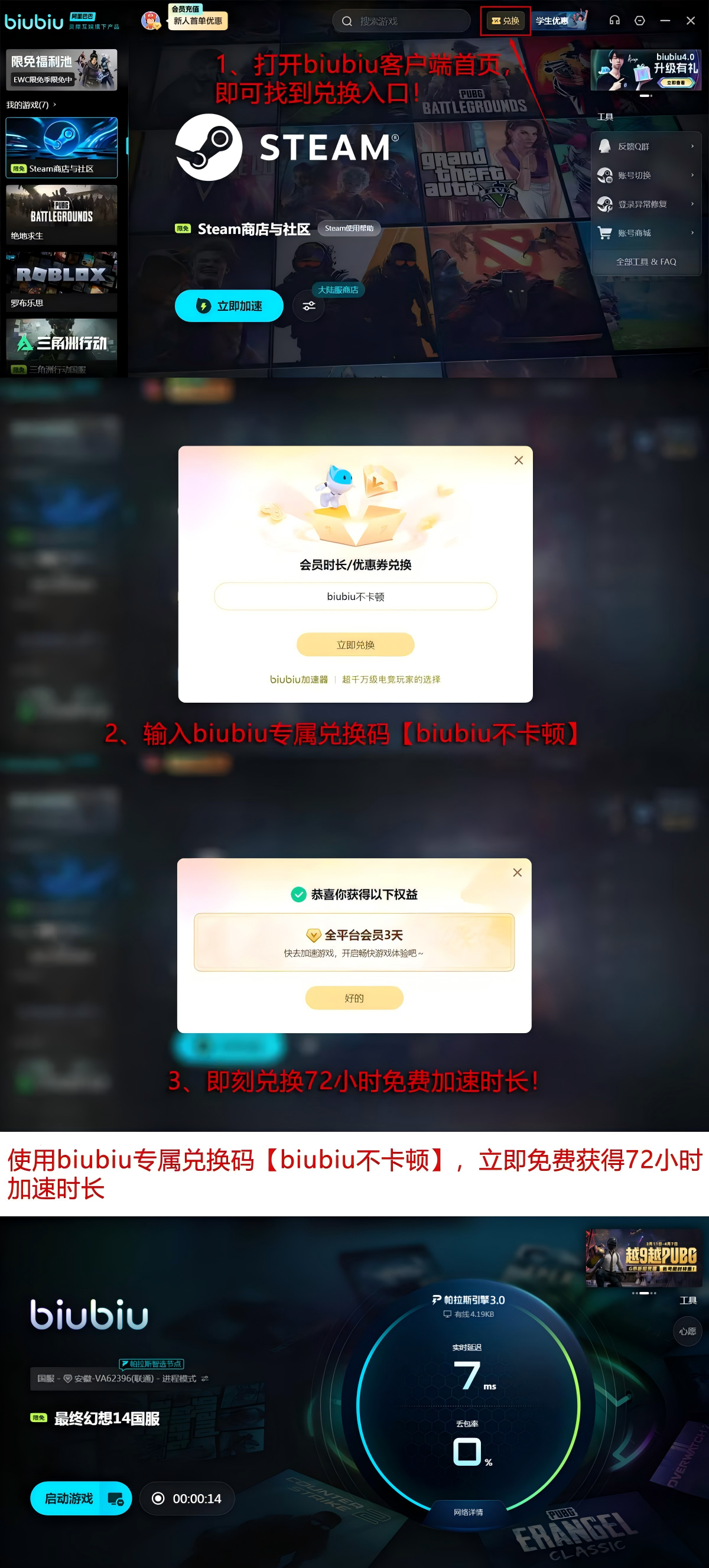 该工具搭载自研帕拉斯引擎3.0,通过毫秒级链路探测与多路径冗余调度技术,动态规避拥塞节点;参数模型经职业电竞选手实测调校,融合PUBG世界冠军左梓轩在高压力网络环境下的低延迟实战经验,显著提升FF14 UDP心跳包成功率与时间戳同步精度。新用户注册后可立即获得24小时全功能免费加速权限;输入专属口令【biubiu不卡顿】,还可额外激活72小时跨平台加速权益,累计享96小时无限制体验。