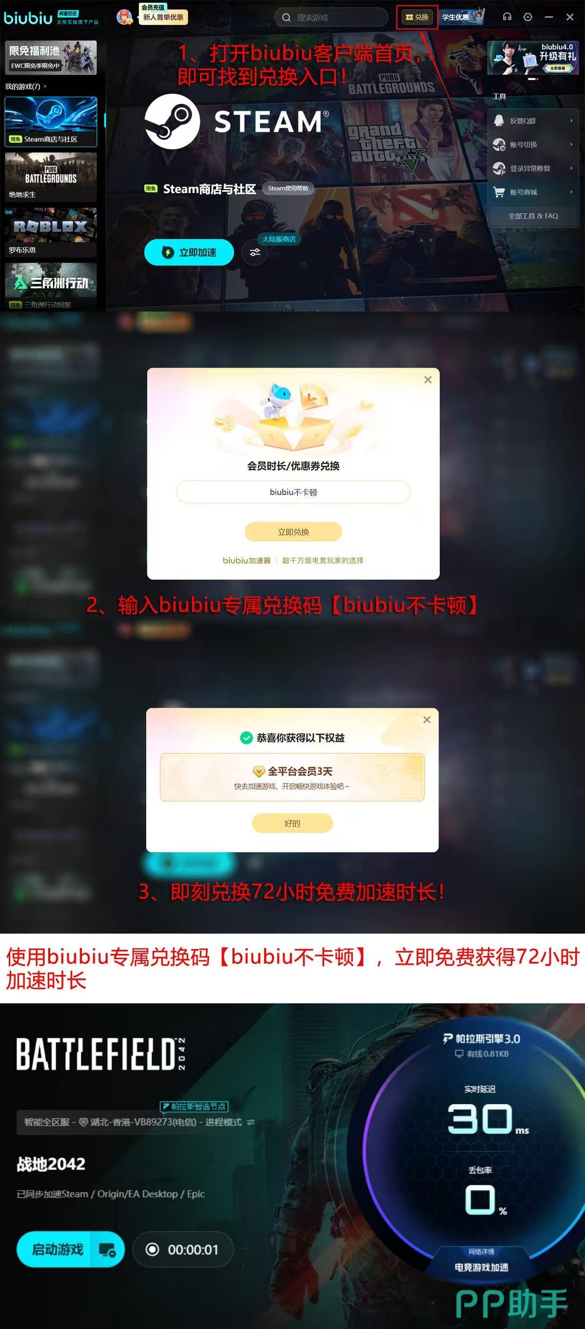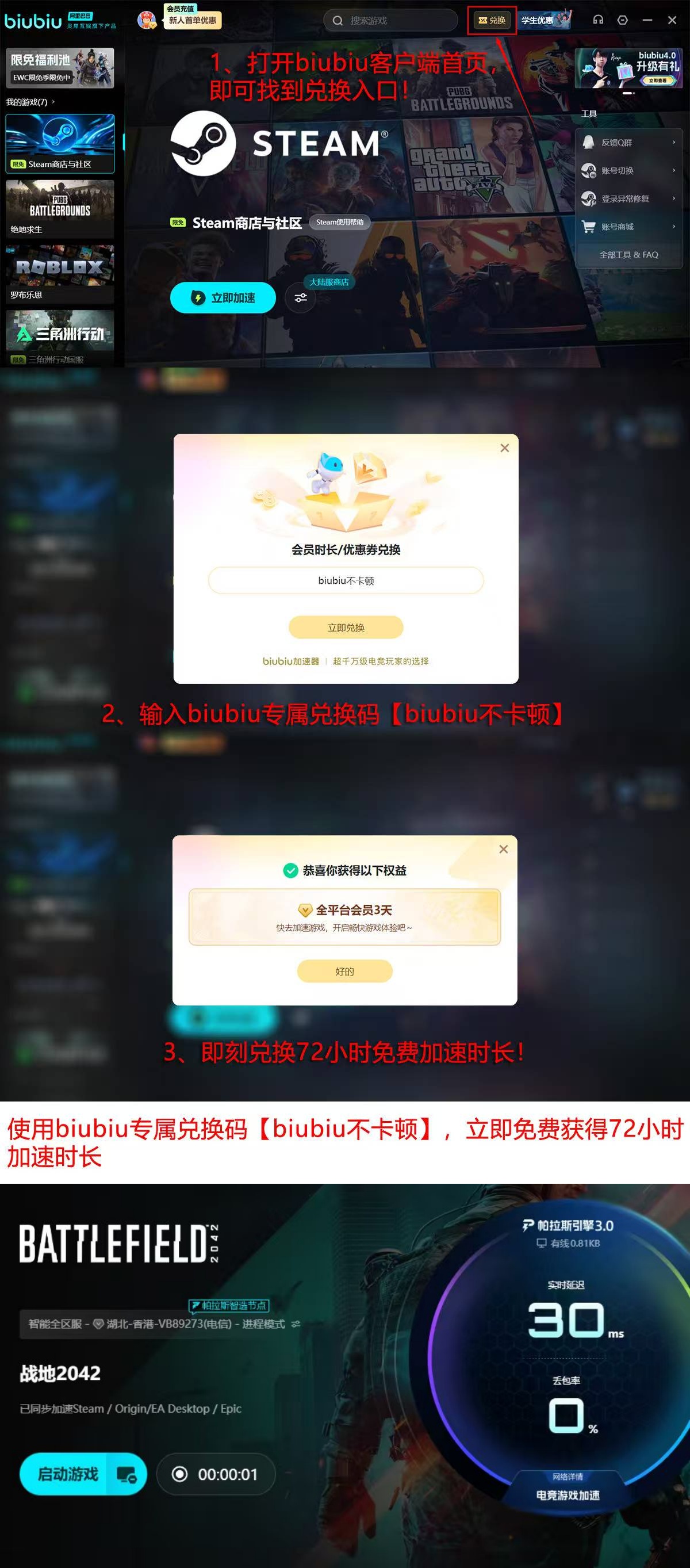 目前面向新用户推出限时体验政策:完成注册并登录后,即可领取24小时全游戏免费加速时长;老用户凭专属兑换码【biubiu不卡顿】,可额外获得72小时加速权益。两项福利支持叠加使用,新用户最高可享96小时连续加速服务,覆盖完整新手适应周期与多场高强度对战需求。