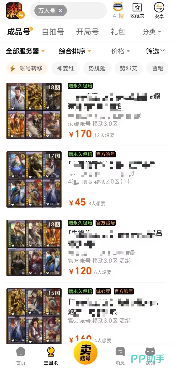 在交易猫平台购买三国杀万人号操作极为直观:打开APP后,在首页顶部游戏分类中选择“三国杀”,即可进入专属商品页;使用关键词“万人号”筛选,系统将智能匹配当前在售账号,涵盖不同等级段(如80级、90级、满级100级)、不同武将组合(SP系、限定皮肤、神将全收集)及不同资源储备(元宝数量、将印数量、专属道具),价格区间清晰标注,便于按预算精准选购。卖家端同样高效——点击底部导航栏“我要卖”,选定三国杀品类,填写账号基础信息并提交审核,最快可实现秒级上架与实时到账。