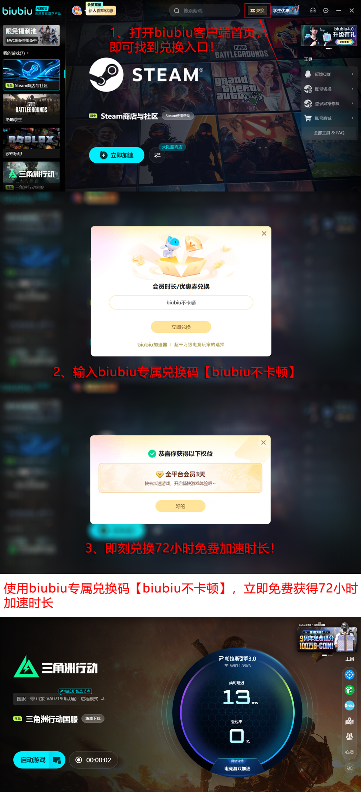 目前biubiu加速器开放新用户专属体验权益:注册全新账号后,可立即获得24小时全功能免费加速时长,登录即用,无需额外激活步骤。另设有通用兑换通道:输入官方发放的兑换码【biubiu不卡顿】,每个账号限用一次,可兑换72小时连续加速权限。平台同步运营活跃社区,涵盖《三角洲》版本更新日志、着色器参数调试指南、硬件适配案例库等内容,便于玩家快速掌握进阶优化技巧并参与技术讨论。