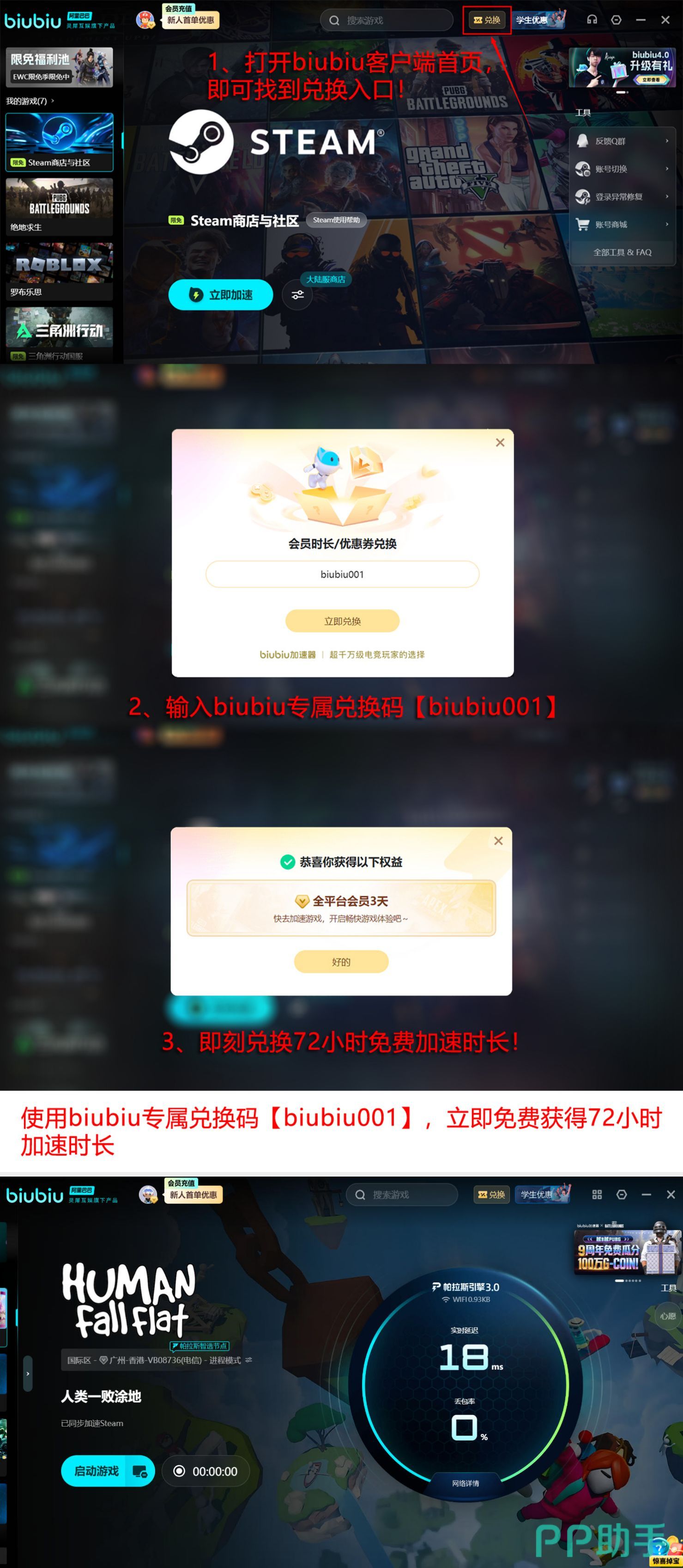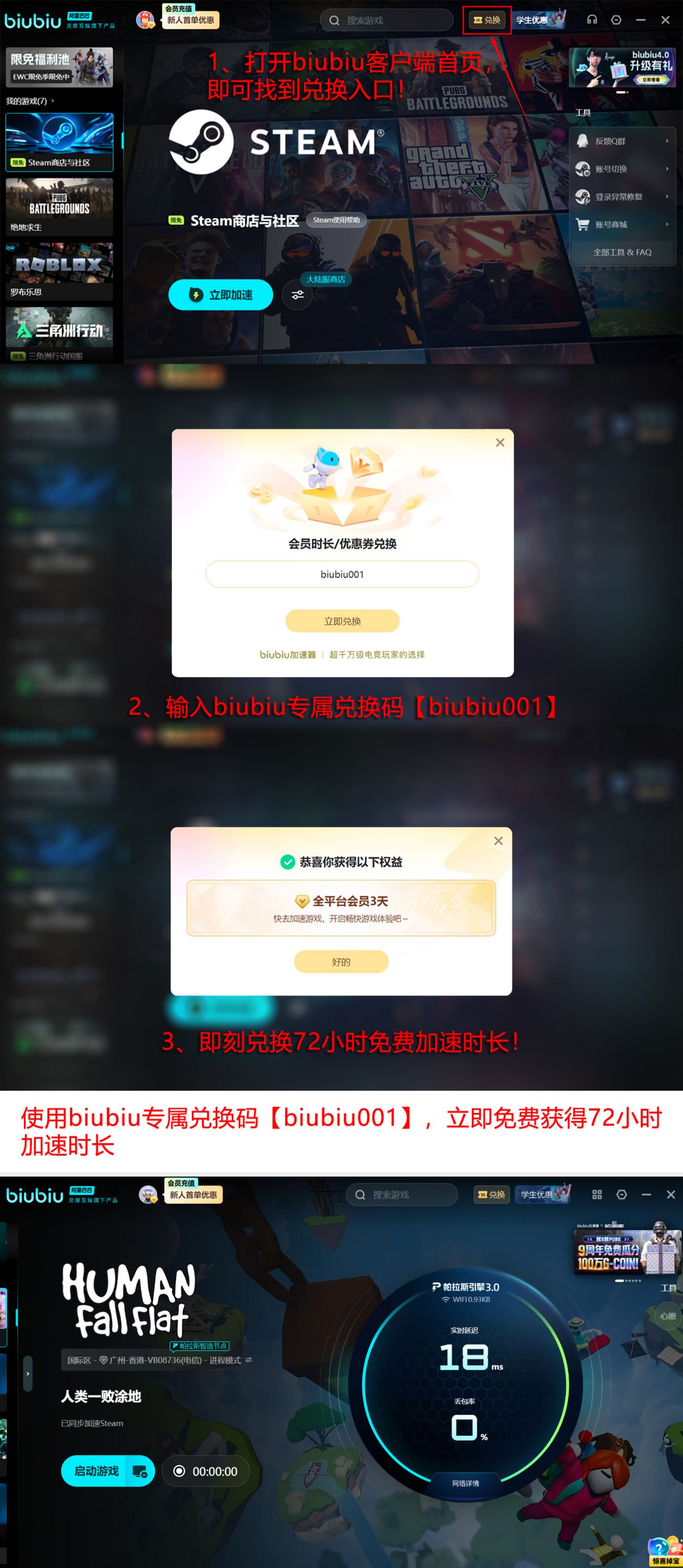 目前官方面向新用户提供阶梯式免费体验方案:首次注册并激活账号即可获得一天全游戏通用加速时长;完成首日体验后,输入专属兑换码【biubiu001】还可额外领取三天加速权益。两项叠加,新用户可连续享受总计96小时无门槛加速服务。