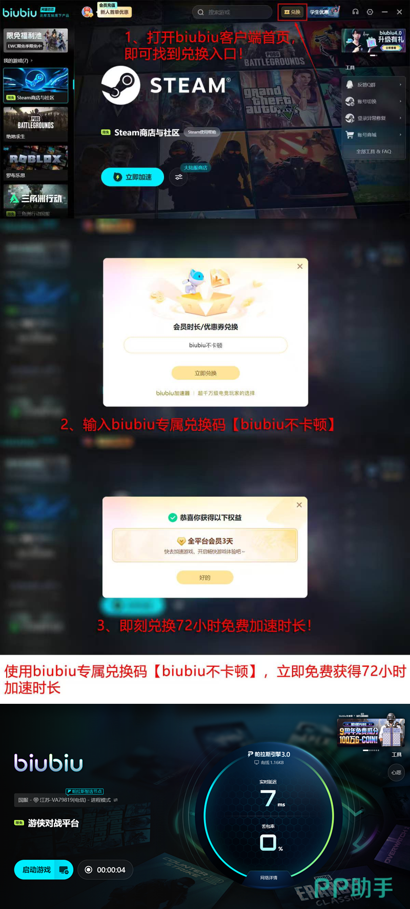 目前平台面向全体用户开放限时福利:新注册账号自动激活24小时全功能加速权限;所有用户(含存量账户)均可额外申领3天高级加速时长,无领取时效约束,可在任意空闲时段通过个人中心兑换。输入专属口令【biubiu不卡顿】即可即时生效。