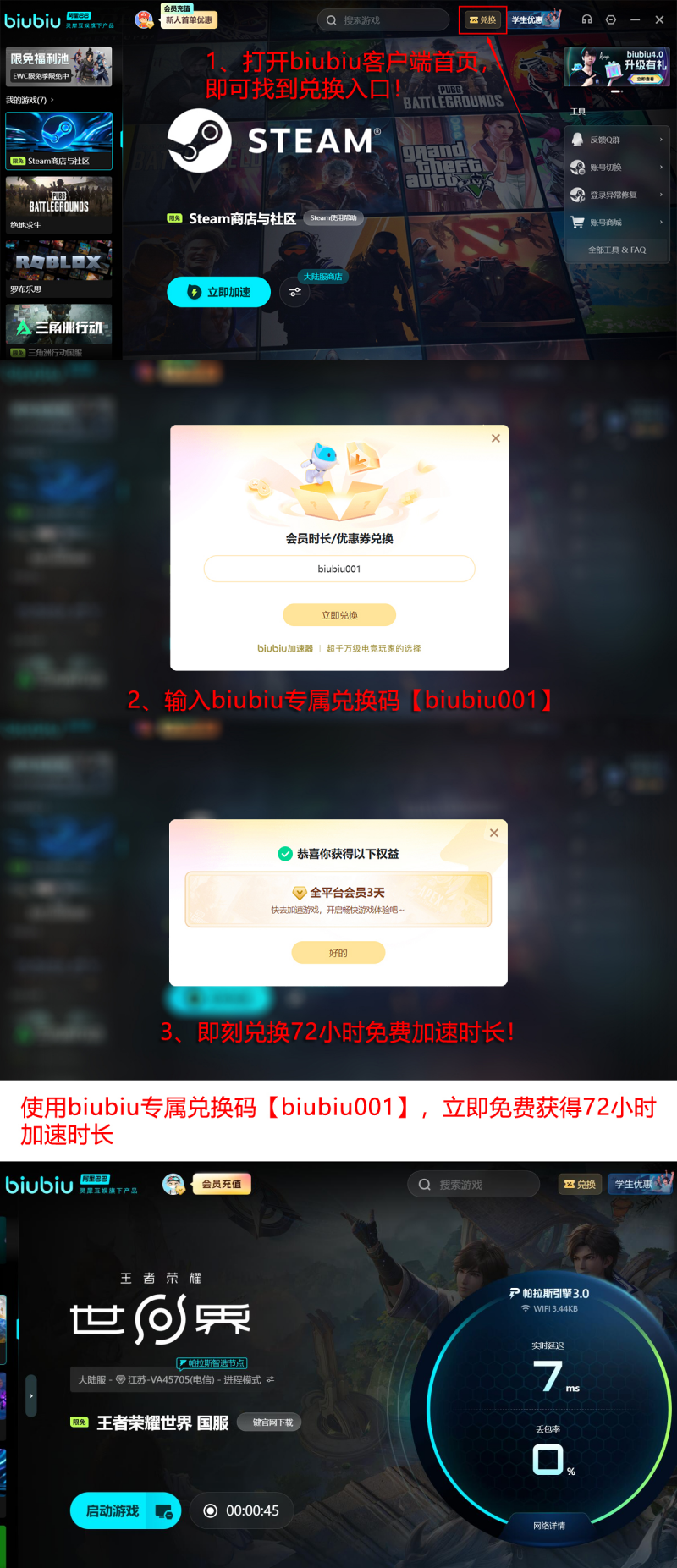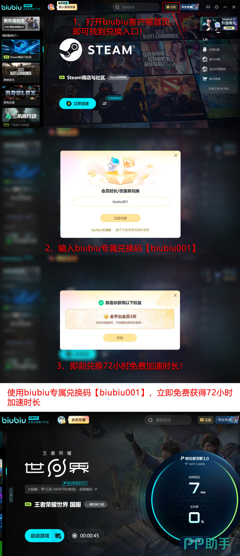 值得一提的是,Biubiu加速器已被PUBG职业选手小叮当列为指定辅助工具,并作为Pero电子竞技战队官方合作加速方案长期使用。基于广泛实战验证与用户反馈,当前版本同步推出限时福利活动:所有用户输入兑换码【biubiu001】即可领取三天免费加速时长;新注册用户额外获赠24小时专属权益;两者叠加使用,最高可享96小时连续加速服务,全面覆盖开服抢滩、新手开荒及日常探索等核心场景需求。