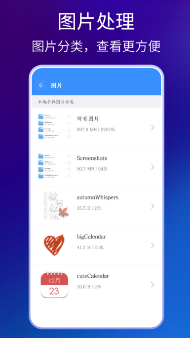 智能自动归类是这款软件的特色,首页会按图片、视频、音频、文档、APK等类型聚合资源,一键直达,降低了查找成本。内置的专业解压模块,兼容各种主流格式,支持多种处理,不用额外安装解压软件。双栏视图可以同时打开两个文件夹,拖拽式处理提升了效率。存储空间分析通过图表,直观显示各目录占用比例,快速定位大文件和冗余文件,辅助清理空间。