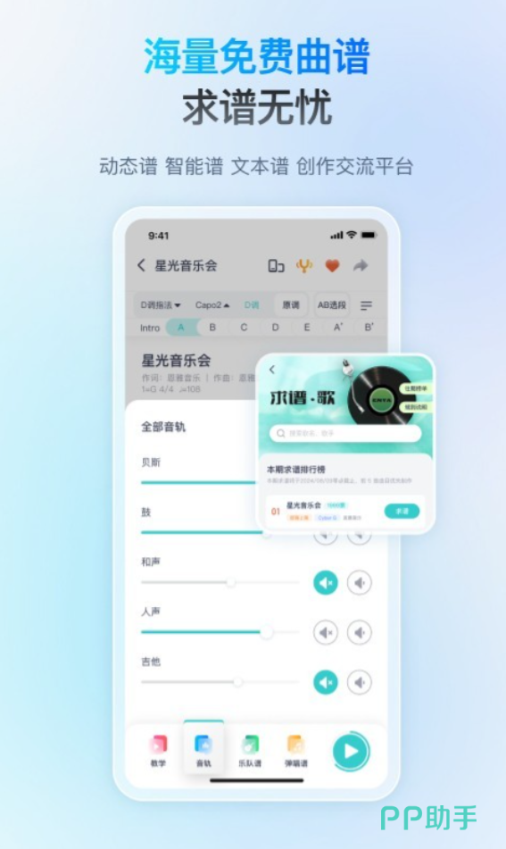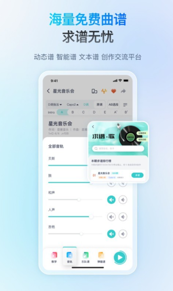 国内首款多轨高清数字音乐应用,分轨播放配合乐谱同步是核心卖点。播放的时候,可以单独开关音轨,想练独奏或者合奏都能实现。乐谱附带和弦演奏技法和声提示,内容比较详细。有变速变调功能,支持调节播放速度和升降调,吉他弹唱会自动适配变调夹和弦。乐谱跟伴奏能精准同步,节拍清晰进度条直观,练习的时候不容易跟丢。