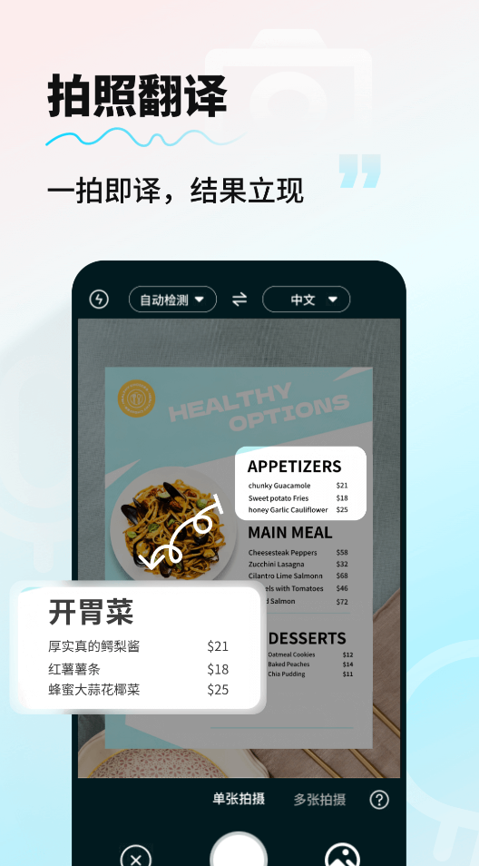 翻译工具选对了,确实能省不少事,出国旅游看不懂菜单的时候,拍一下就能知道是什么菜,工作里遇到外文合同,也不用到处找人帮忙,学外语的时候,碰到不懂的句子,也能快速查清楚意思。赶紧来选几款用下吧,肯定会有你的菜。