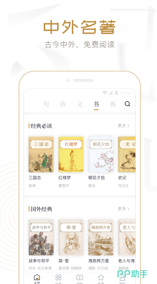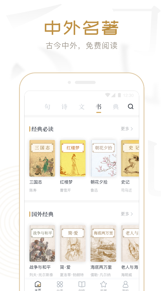 经典文学传播是核心定位,收录了近百万名言金句、诗词曲赋,还有近万部中外古籍和小说名著。先秦诸子百家、唐诗宋词元曲,这些中国经典都能找到,莎士比亚、巴尔扎克的作品也有收录。历史典故、成语典故标注了含义、出处和用法,分类做得比较细。作者精选板块,可以通过作者了解各朝代文学作品,听书功能提供了精华解读音频,半小时能提炼书中核心内容。界面简洁,操作流畅,支持个性化阅读设置,名句推荐功能会推送精选诗词名句,适合碎片化时间品味文学。