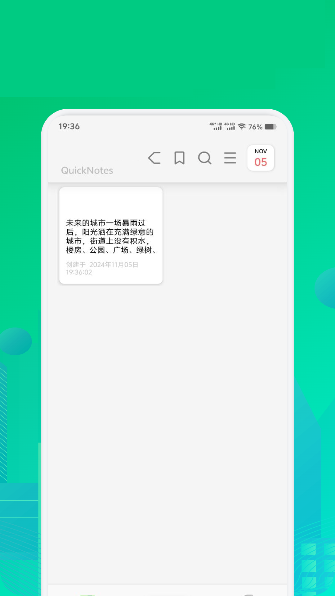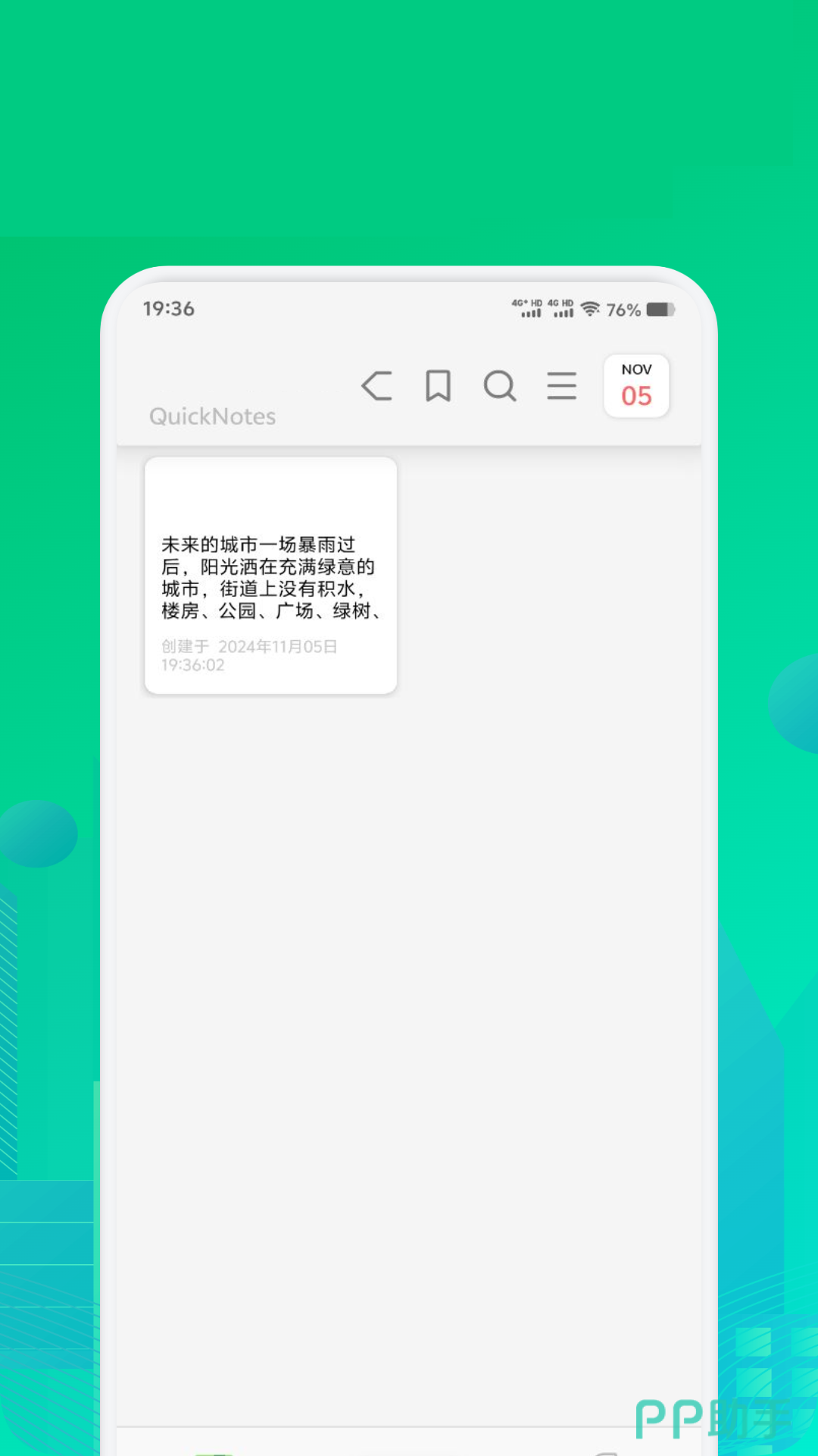 听说该软件是一个非常用心的程序,因为这个是真心为用户而着想开发出来的,操作画面简单极易上手,最主要的是笔记排版也是非常简洁的,撰写起来会更轻松,清晰。