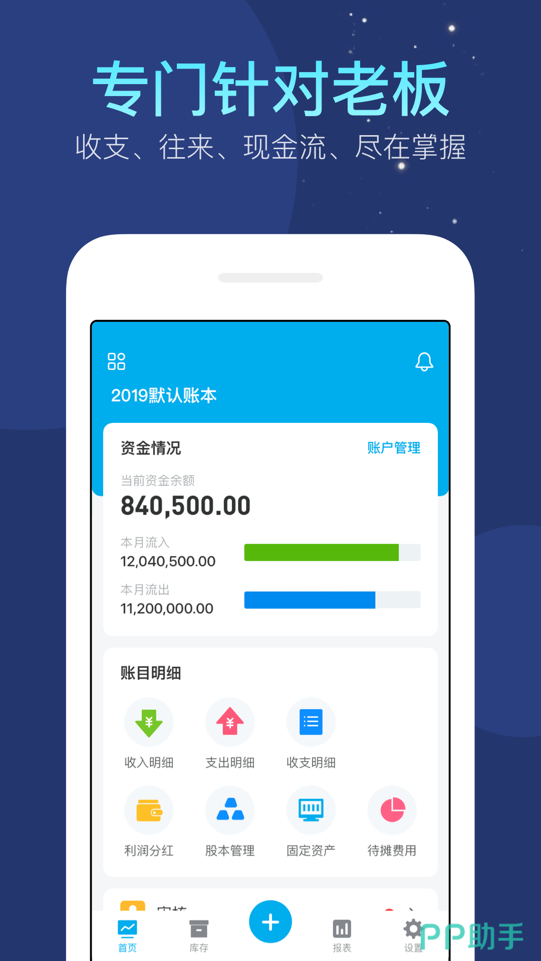 专门为中小企业老板提供的记账软件,可用于店铺进销账单的管理,每一笔支出都可以记录,同时针对企业主关心的内容,定制了各种可视化的内容,比如报表,库存单等信息,实时显示,老板们再也不用,每天晚上自己 一个个的算了,只需要打开软件,当天信息报表就能直接查看。