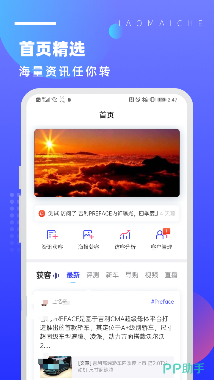 卖车还在靠碰运气?这款app简直是销售人的开挂神器,发文章,搞直播,做海报,花式曝光吸引客户,还能精准跟踪访客,连客户喜好都能摸清楚,再也不用盲目打电话,发传单,获客效率直接拉满,这波躺赢卖车的快乐,不冲错过会拍大腿的。